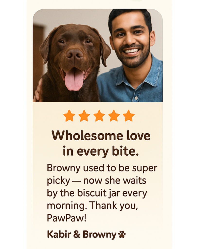 At PawPaw, we know dogs are family — and family deserves real food. That’s why we use clean, 100% vegetarian ingredients, free from anything artificial. Our biscuits aren’t just treats — they’re little moments of joy, baked into every bite.